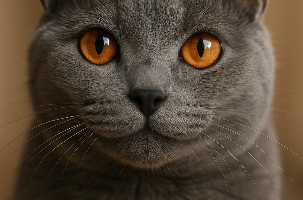 Les yeux du Chartreux sont un autre atout majeur. Ils sont grands, ronds et expressifs, avec des teintes allant du jaune-or au cuivre intense. Ce contraste entre le pelage gris-bleu et les yeux lumineux crée une harmonie visuelle saisissante.